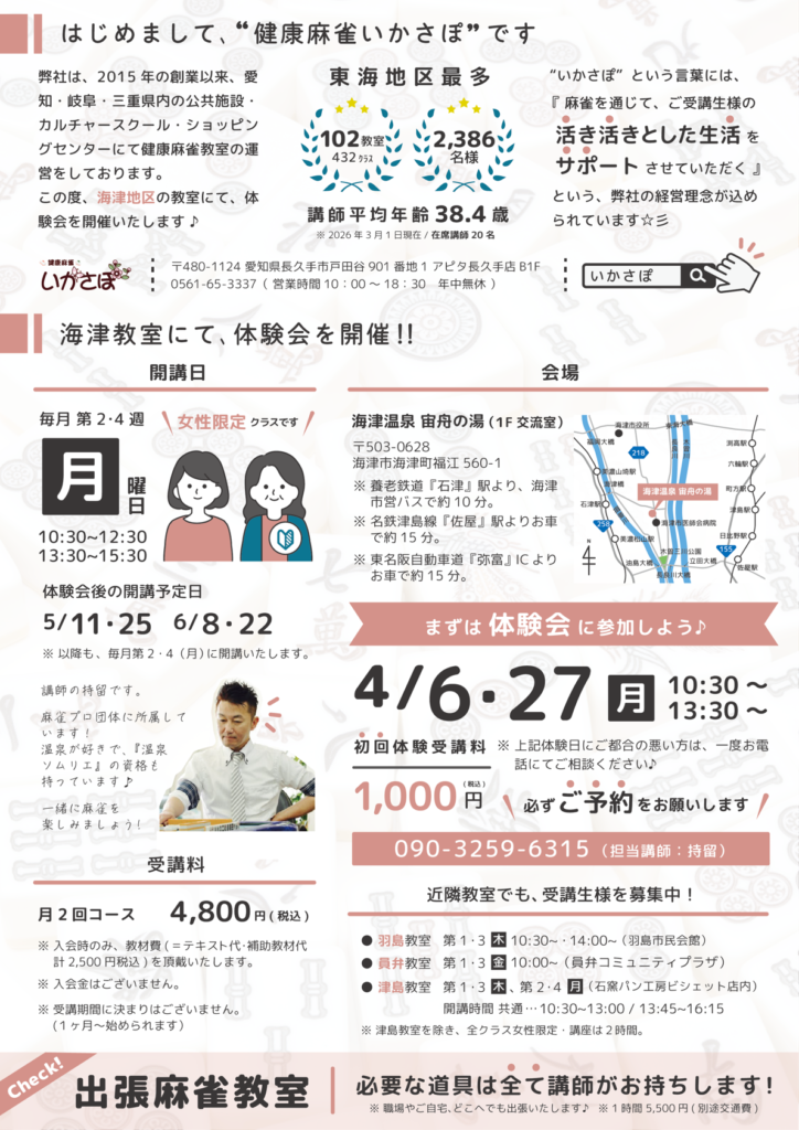 4/6(月)・4/27(月)。海津温泉の木曽交流室にて、レディース麻雀教室を開講いたします。賭けない・飲まない・吸わない・女性限定の教室です。