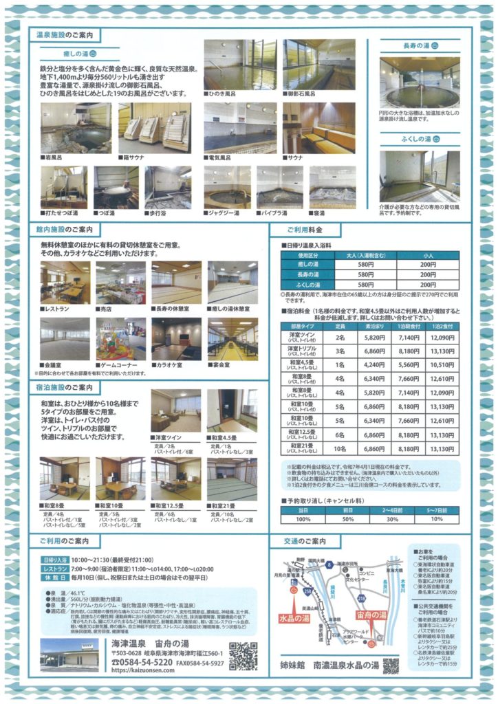 海津温泉宙舟の湯では「温泉宴会」を推奨しております。「チラシを見た。」で食前酒をサービスいたします。これまでの中で、更に低料金プランのご要望があり、「松花堂弁当」コースも始めました。定番の「三川会席」コース、1グレードアップの「海津会席」コース、更に極みの「宙舟会席」コースと多様な品揃えで皆様をお待ちしております。また、近隣の方であれば、送迎(10名以上の場合)もご利用いただけます。合わせて飲み放題プランもご利用いただきたくご案内申し上げます。詳しくはお電話にて。