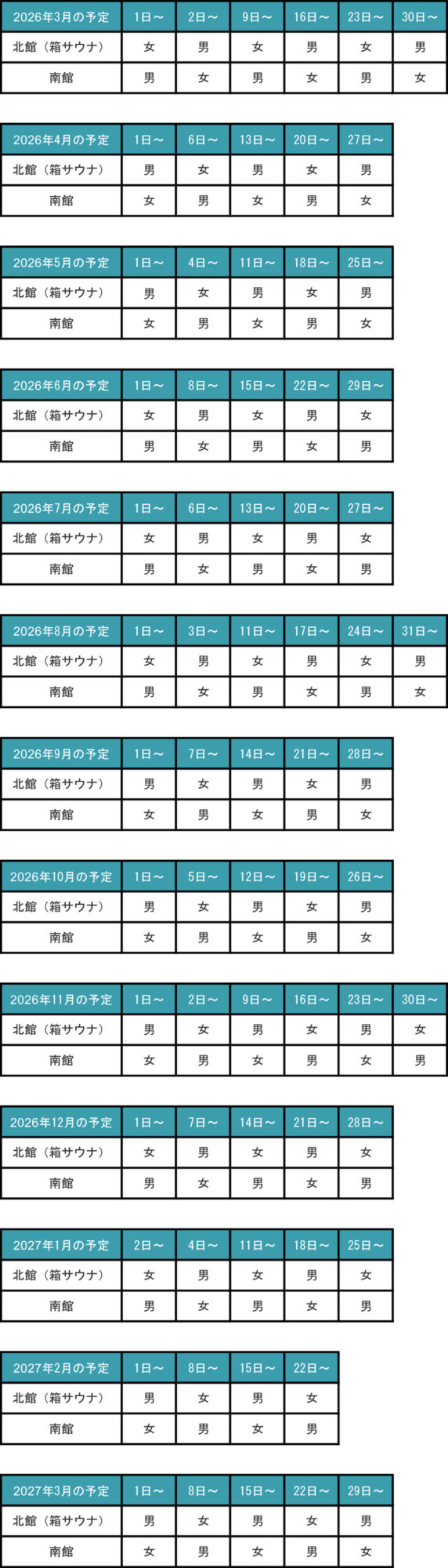 男女入れ替え サウナ予定表